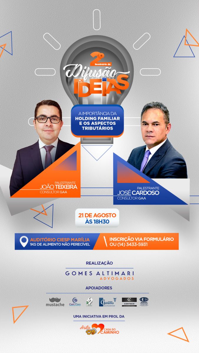 O escritório Gomes Altimari Advogados realizará no próximo dia 21/08 o 2º Seminário de Difusão de Ideias, desta vez tendo como tema a sucessão patrimonial, com enfoque para "Holding Familiar e os aspectos tributários". Na inscrição, os interessados também estarão contribuindo com um quilo de alimento não perecível que será destinado ao Asilo Casa do Caminho que deverá ser entregue no dia do evento.