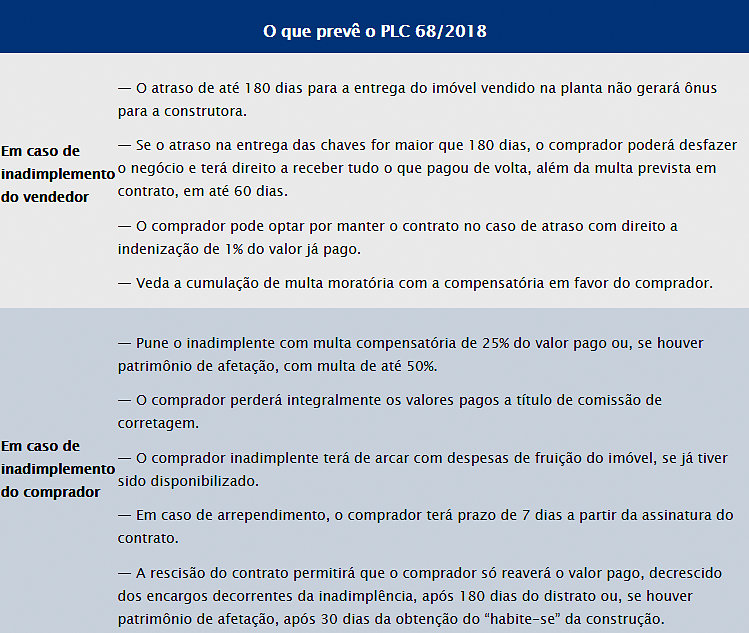 Os senadores favoráveis argumentam que o projeto atualiza as regras, dando segurança jurídica às construtoras e aos consumidores na hora da negociação. Por outro lado, há parlamentares que consideraram o texto mais favorável às empresas, sendo necessário mais equilíbrio.