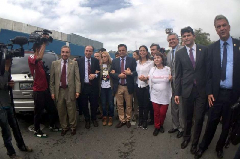 O micro-ônibus que transportava Aécio Neves (PSDB), Aloyzio Nunes (PSDB), Cássio Cunha Lima (PSDB), Ronaldo Caiado (DEM), Agripino Maia (DEM) e Sérgio Petecão (PSD) teve a passagem bloqueada por manifestantes após deixar o aeroporto que dá acesso a Caracas, capital venezuelana. Os senadores contaram que objetos foram arremessados contra eles, impedindo que o grupo deixasse o litoral de La Guaira.