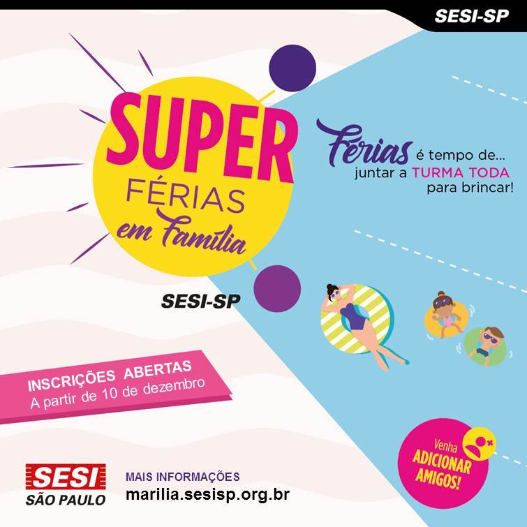 Em Marília, a programação do Super Férias em Família começa na segunda-feira (dia 7) e prossegue até 31 de janeiro, das 13h às 17h, de segunda a sexta. No dia 26 de janeiro (sábado) das 9h às 16h acontece o Camping Super Férias.