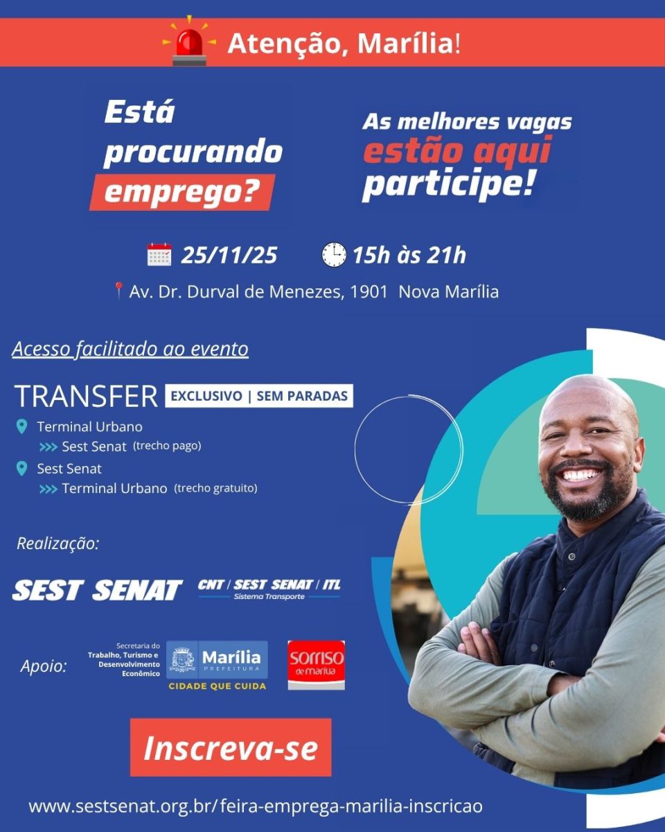 A feira “Emprega Transporte”, que tem apoio da Prefeitura, vai ocorrer das 15h às 21h, nas próprias dependências do Sest/Senat, localizado na Av. Durval de Menezes, 1.901 (bairro Nova Marília, na zona Sul).