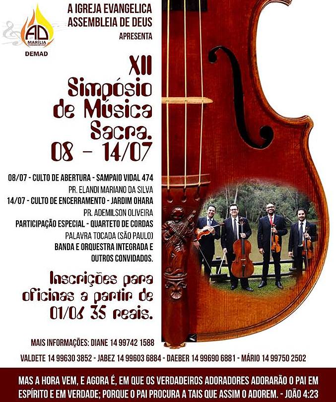 A Igreja Evangélica Assembleia de Deus de Marília inicia neste domingo (08) o 12º Simpósio de Música Sacra. O Congresso está oferecendo atividades de canto, regência e oficinas com vários instrumentos musicais: violino, violoncelo, trompa, trompete, clarinete, trombone, entre outros. O evento prossegue até dia 14, quando haverá apresentação do Quarteto de Cordas Palavra Tocada (de São Paulo).