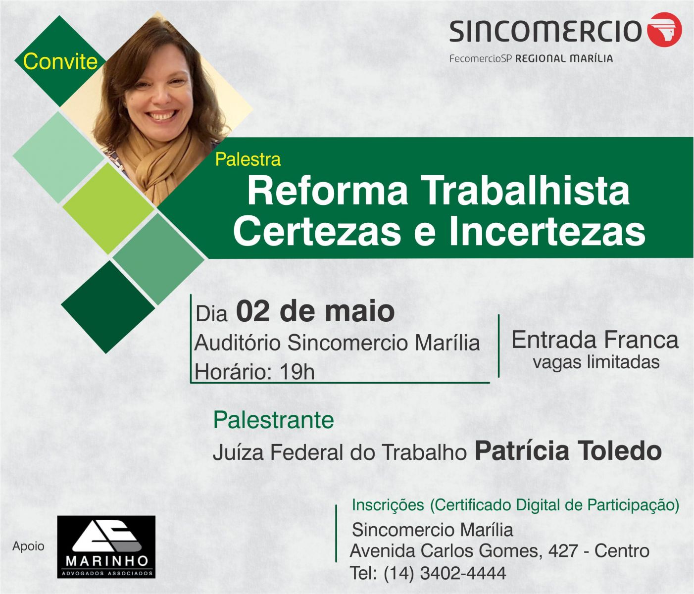 Devido a grande procura sobre informações a respeito da Reforma Trabalhista, principalmente sobre as principais dúvidas sobre como ficará a legislação com a perda da validade da medida provisória (MP) que alterava pontos da reforma, o Sincomercio Marília promove em 2/5, a partir das 19h, a palestra “Reforma Trabalhista – Certezas e Incertezas".