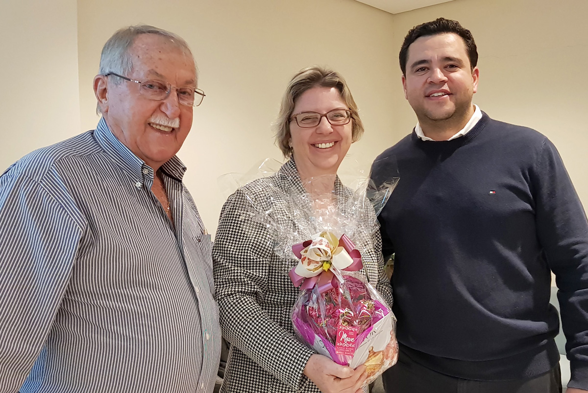 Pedro Pavão, presidente do Sincomercio Marília e Diogo Cardoso Pereira da Promed - Saúde do Trabalhador e Perícias Médicas com Marilda Frigui de Oliveira Moreira, ganhadora do sorteio realizado durante a palestra