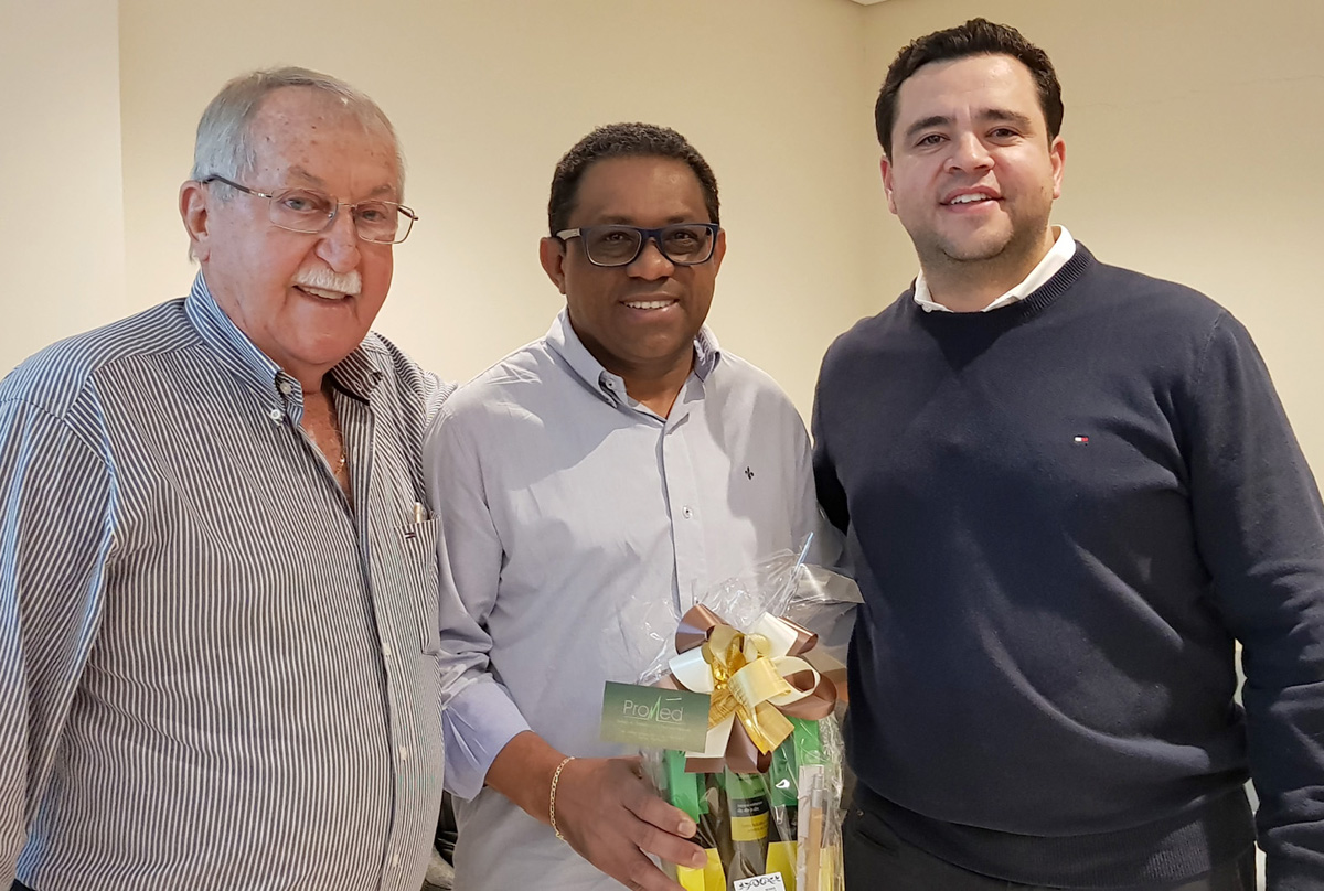 Pedro Pavão, presidente do Sincomercio Marília e Diogo Cardoso Pereira da Promed - Saúde do Trabalhador e Perícias Médicas com Luis Carlos Simões Rodrigues, ganhador do sorteio realizado durante a palestra