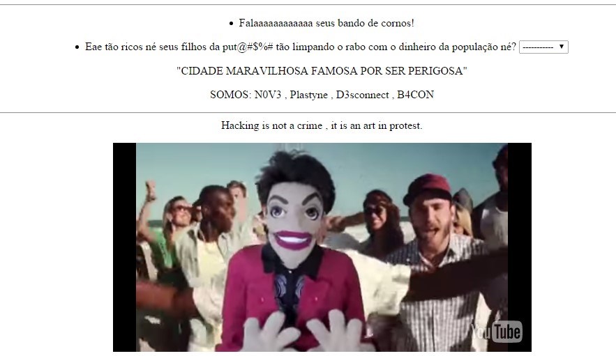 A página oficial do Partido dos Trabalhadores foi invadida pelo grupo de hackers Anarchy Ghost — de acordo com a descrição na página hackeada, os invasores teriam sido N0V3 , Plastyne, D3sconnect e B4CON. No site, eles ainda afirmam que hackear "não é um crime, mas uma forma de arte de protestos". E você consegue imaginar o que eles fizeram para mostrar para todo o mundo que o site foi mesmo invadido?