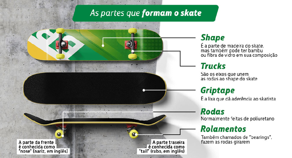 O skate é um esporte radical realizado sobre uma prancha com rodas e consiste na execução de manobras no chão, pistas e em obstáculos. A prática surgiu nos Estados Unidos e atualmente é um esporte olímpico desde os jogos de Tóquio (2021).
