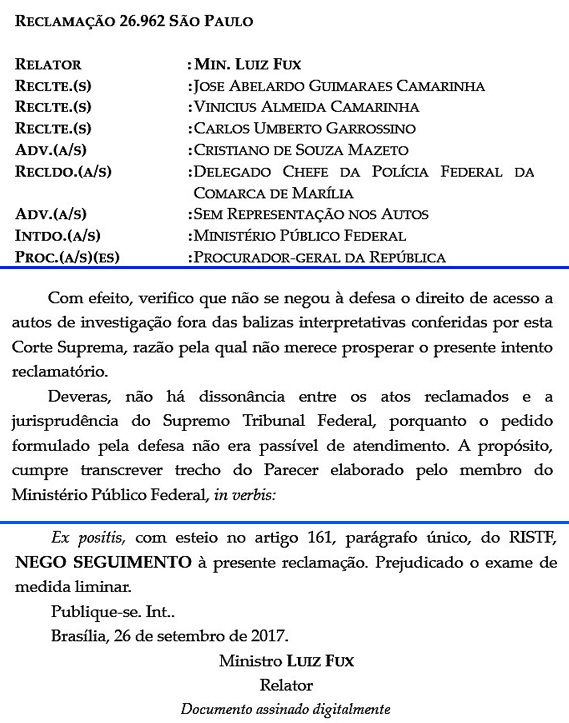 O Ministro Luiz Fux lembra, no seu despacho, que "A medida cautelar foi indeferida. Informações foram prestadas e a Procuradoria-Geral da República manifestou-se pela improcedência da reclamação".
