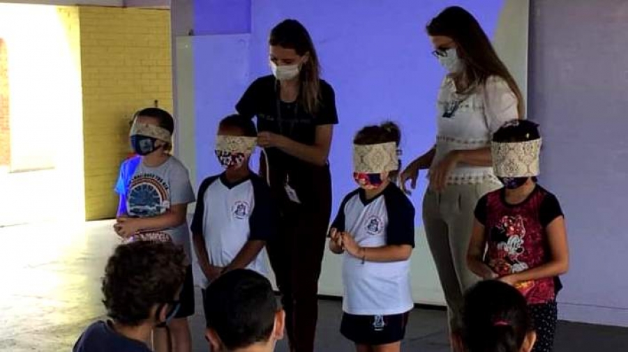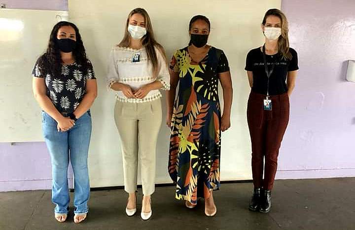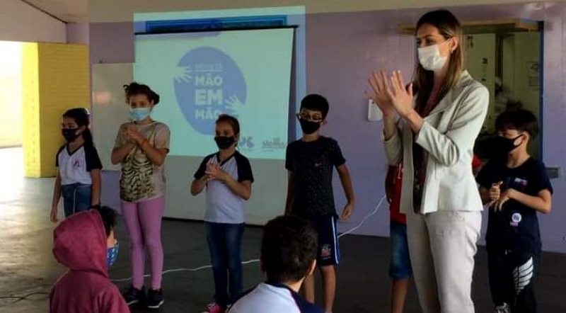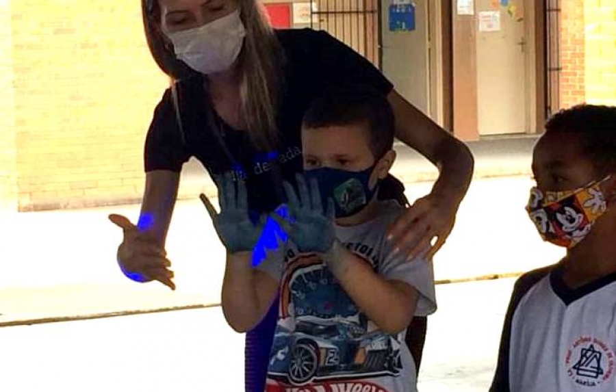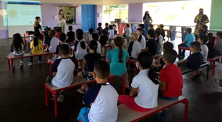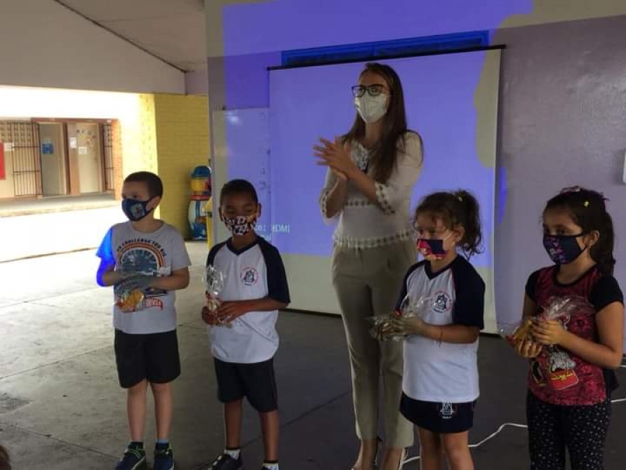 Ela esteve na escola para conscientizar as crianças sobre a importância de seguir os protocolos sanitários contra a Covid-19 durante esse período em que as escolas estão recebendo novamente, em sala de aula, os alunos.