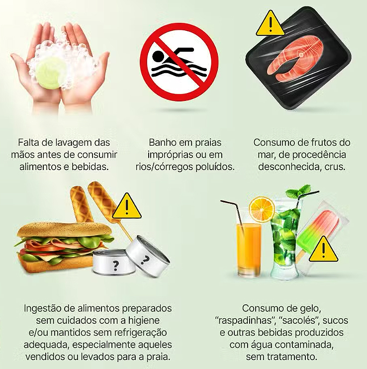 Se apresentar estes sintomas, procure um médico imediatamente. Evite consumir alimentos ou bebidas de origem duvidosa e fique atento às condições de balneabilidade das praias.