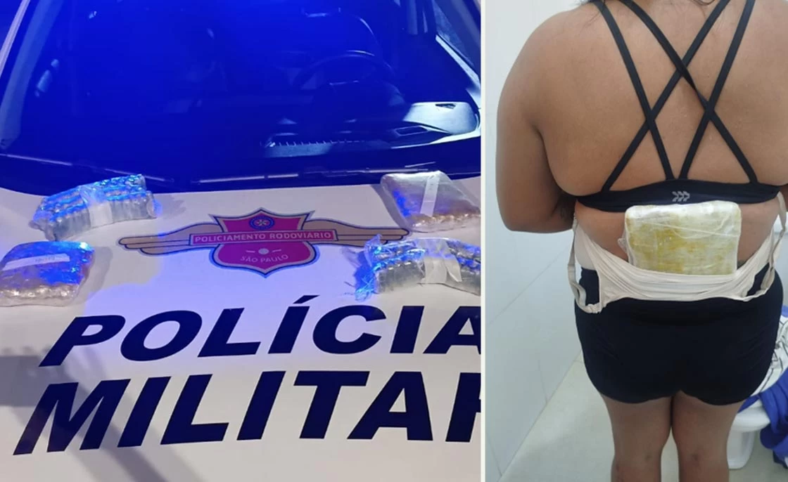 Durante a fiscalização, duas passageiras apresentaram respostas desconexas, levantando suspeitas. Na busca pessoal, os policiais localizaram dois tabletes grandes de cocaína presos junto às costas das mulheres, em formato semelhante a placas de colete balístico (foto).