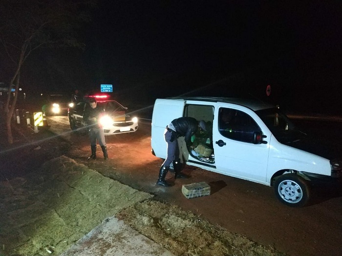 O motorista entrou numa plantação de milho, onde ele e o passageiro fugiram a pé. Dentro do automóvel (um Fiat/Doblo, placas de Cascavel/PR) foram encontrados 22 fardos do entorpecente, pesando no total 398 quilos.