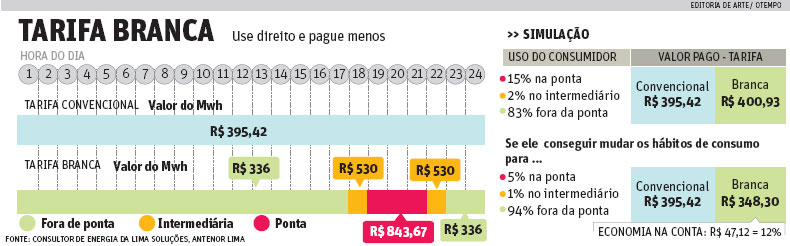 Com a tarifa branca, o consumidor passa a ter a possibilidade de pagar valores diferentes em função da hora e do dia da semana em que consome a energia elétrica. Se o consumidor adotar hábitos que priorizem o uso da energia nos períodos de menor demanda (manhã, início da tarde e madrugada, por exemplo), a opção pela tarifa branca oferece a oportunidade de reduzir o valor pago pela energia consumida.