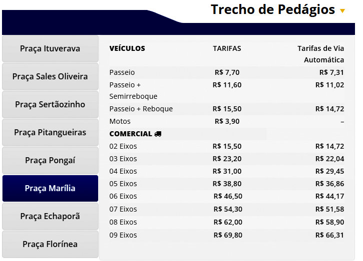 Confira, nas tabelas abaixo, as novas tarifas nas praças da região de Marília, na rodovia SP-333 em Marília (veja abaixo) Pongaí, , Echaporã e Florínea.