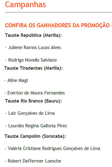Os sorteios foram realizados neste domingo, em solenidades públicas nas lojas do Tauste em Marília (Norte e Sul), Bauru e Sorocaba, acompanhadas pelos clientes e com participação de crianças escolhidas de forma aleatória para a retirada dos cupons. Os clientes contemplados foram procurados logos após o sorteio.