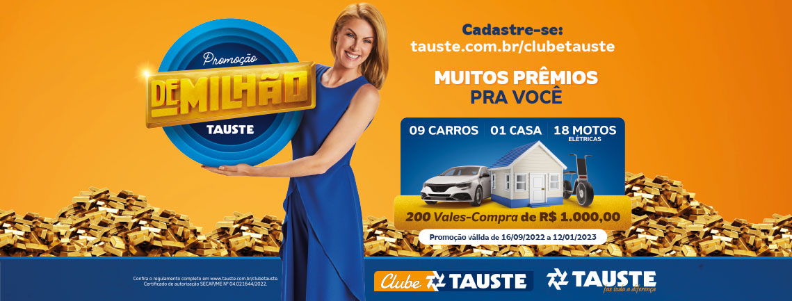 A participação será válida até o dia 12/01/2023 às 23h59 e o sorteio será realizado pela extração da Loteria Federal no dia 14/01/2023 conforme regulamento, que poderá ser consultado no site www.tauste.com.br/clubetauste ou no SAT (Serviço de Atendimento Tauste) presente em todas as lojas da rede.