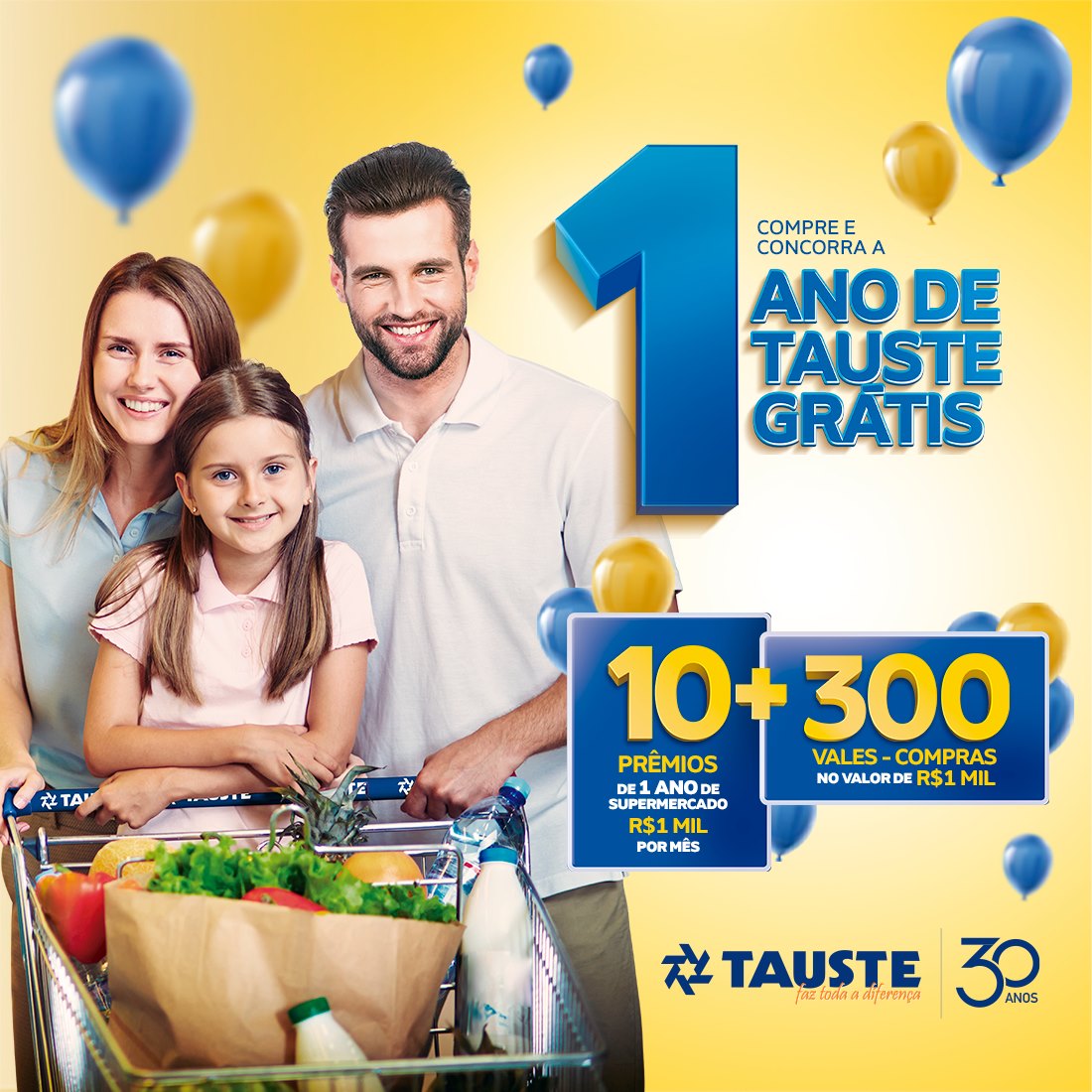 O Tauste Supermercados já iniciou a campanha “1 ano de Tauste Grátis". Serão sorteados 300 vales-compras no valor de R$1 mil e mais 10 prêmios de vales-compras no valor de R$1 mil todo mês por 1 ano, para toda a rede.