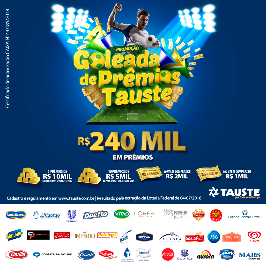 A campanha “Goleada de Prêmios Tauste” está se encerrando. Os clientes Tauste terão até segunda feira (dia 02 de Julho), para participar da promoção. Serão R$ 240 mil distribuídos em 100 vales compras de R$1 mil, 20 vales compras de R$ 2 mil e certificados em barras de ouro, sendo 10 prêmios de R$5 mil e 5 prêmios de 10 mil.