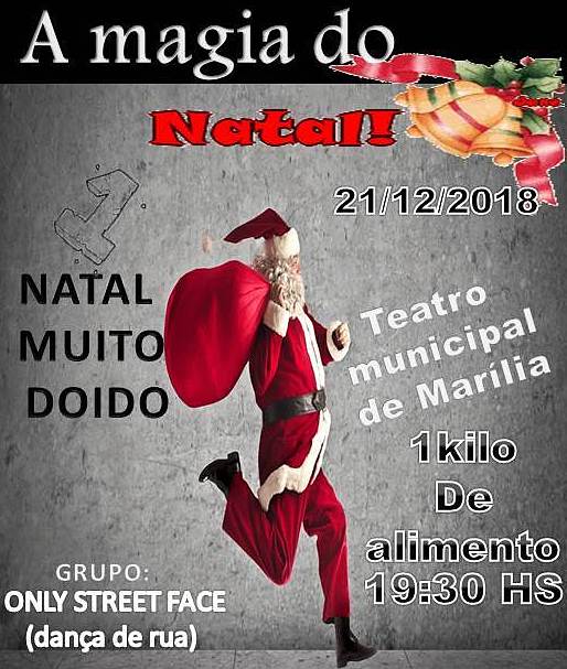 O Teatro Municipal “Waldir Silveira Melo” recebe nesta sexta-feira (21), às 19h30, o espetáculo de Dança de Rua “A Magia do Natal – Um Natal Muito Louco”, do grupo de dança Only Street Face. A entrada é 1 kg de alimento não perecível.
