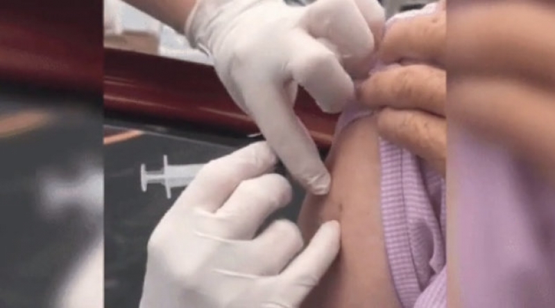 Nas imagens, a técnica de enfermagem aplica a vacina em uma idosa e mostra a seringa para a filha da mulher, que grava o vídeo. Em seguida, a profissional da Saúde caminha em direção a um idoso, motorista do veículo, ele se levanta e ela finge aplicar o imunizante.