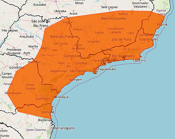 As pancadas de chuva devem varia de moderadas a fortes, com raios, trovoadas e risco de temporais no sul de Minas, leste paulista e interior fluminense.