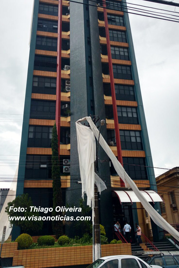 Uma rede usada para manutenção de prédios voou com a força do vento e foi parar na rede elétrica em frente