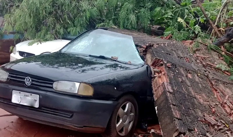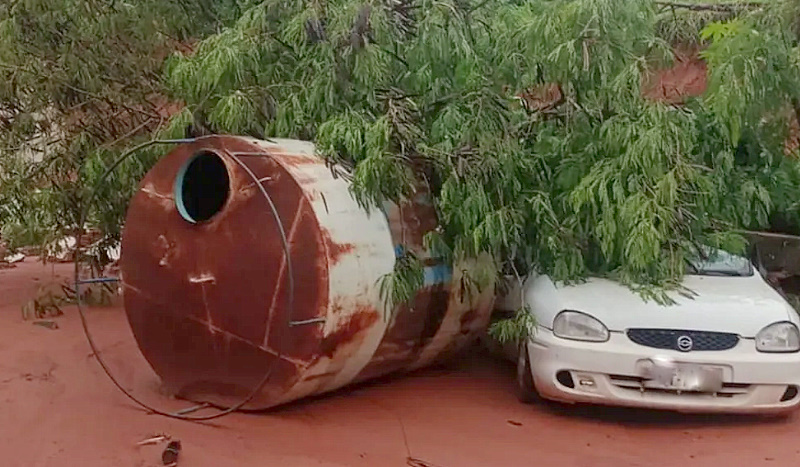 De acordo com o Corpo de Bombeiros, 13 árvores caíram. Uma delas em cima de dois carros que ficaram danificados.