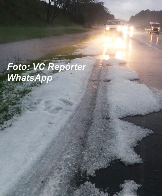 Granizo que atingiu a rodovia que liga Bauru a Jaú.
