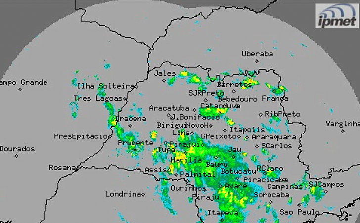 Agora à noite, os radares meteorológicos do IPMet/UNESP, localizados em Bauru e Presidente Prudente, estão detectando chuvas moderadas a fortes, acompanhadas por descargas elétricas, em várias regiões do estado de São Paulo.