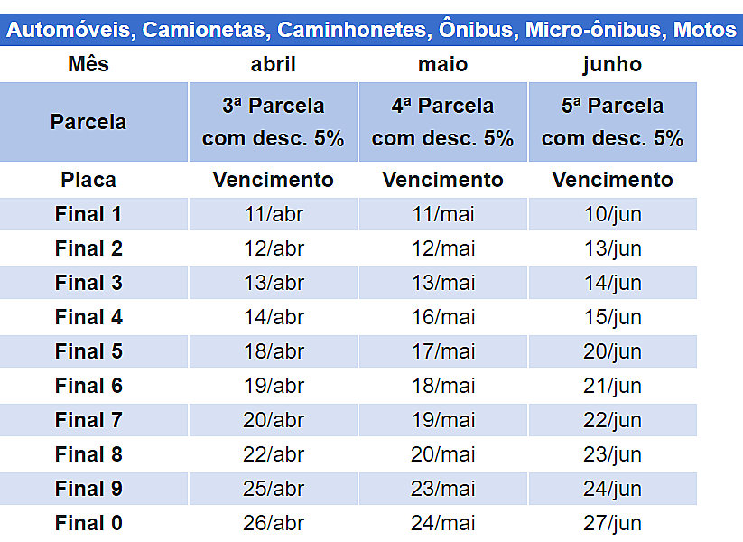 O calendário de vencimento de acordo com o final de placa dos veículos segue até 26 de abril, considerando apenas os dias úteis (veja na tabela abaixo).