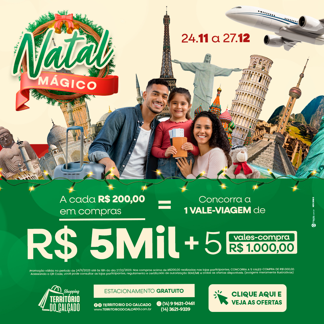 Até às 18h do dia 27 de dezembro, a cada R$200,00 em compras nas lojas participantes, os clientes entram no sorteio de 1 vale-viagem no valor de R$5 mil, além de 5 vales-compra de R$1.000,00 cada.