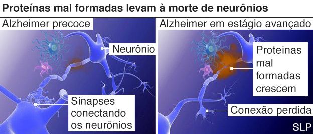 Acredita-se que a formação das placas de amilóides entre os neurônios leva ao dano e, depois, à morte da célula.