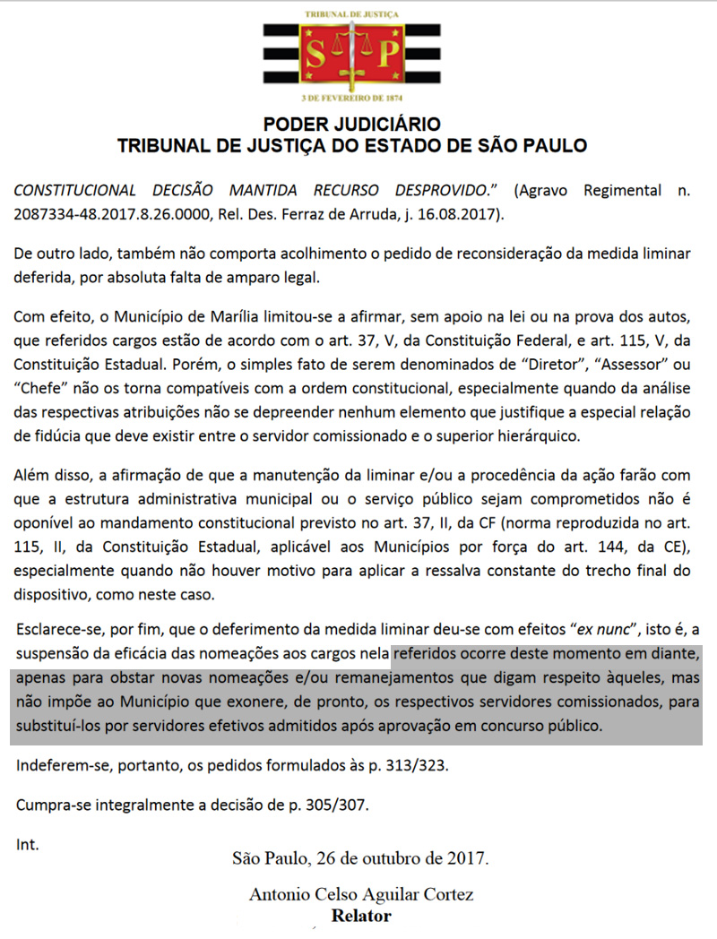 "Esclarece-se, por fim, que o deferimento da medida liminar deu-se com efeitos “ex nunc”, isto é, a suspensão da eficácia das nomeações aos cargos nela referidos ocorre deste momento em diante,apenas para obstar novas nomeações e/ou remanejamentos que digam respeito àqueles, mas não impõe ao Município que exonere, de pronto, os respectivos servidores comissionados, para substituí-los por servidores efetivos admitidos após aprovação em concurso público", ressalta o desembargado Antonio Celso Aguilar Cortez.