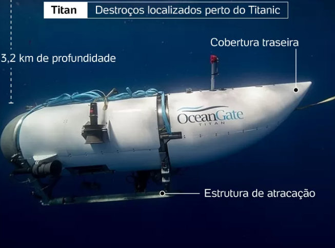 O submersível, apelidado de "Titan", submergiu na manhã de domingo, 18 de junho. Os turistas queriam ver os destroços do Titanic, localizado no Atlântico Norte.