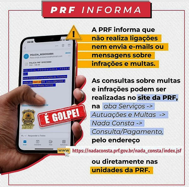 Nomes e siglas de órgãos públicos, especialmente os que atuam na atividade de fiscalização, como é o caso da PRF (Polícia Rodoviária Federal) estão sendo usados de forma recorrente por criminosos para aplicar golpes contra pessoas de boa-fé.