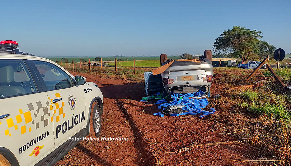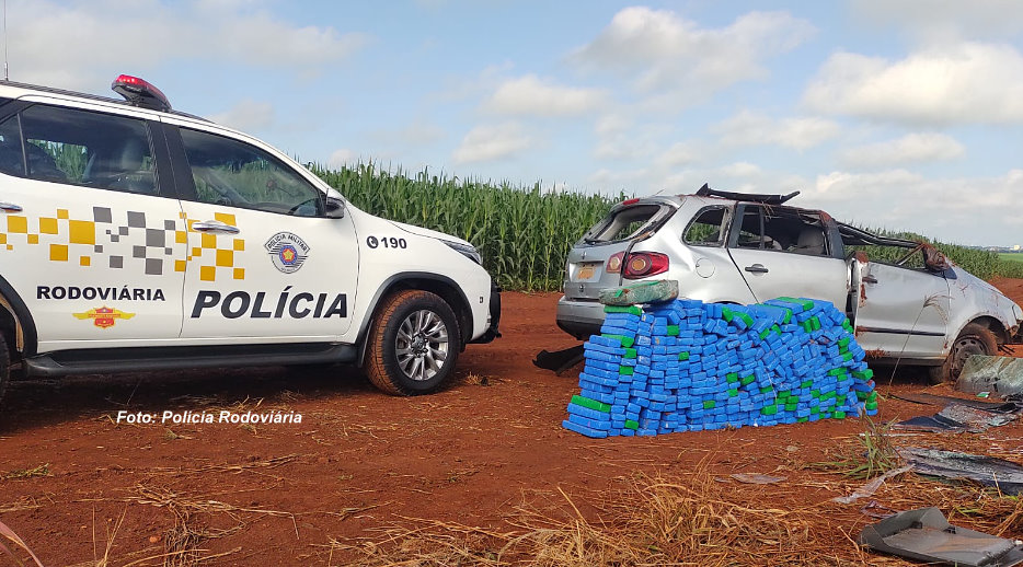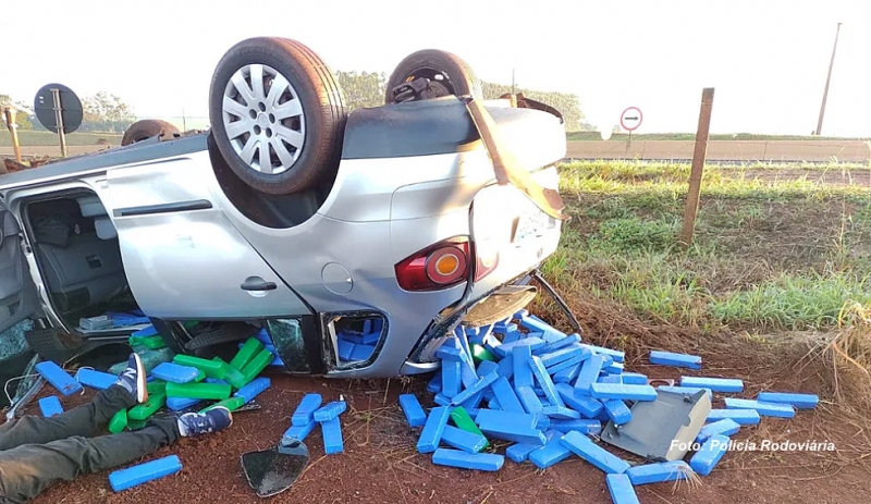 Em determinado momento, o condutor perdeu o controle do carro que acabou capotando às margens da rodovia. Com o acidente, a droga (331 pacotes) ficaram espalhados pelo local.