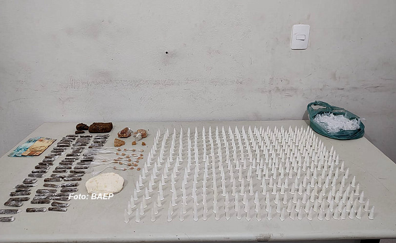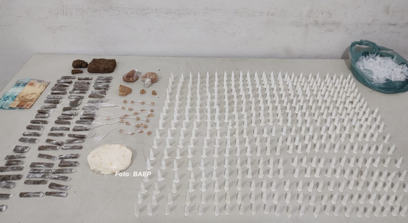 Com ele, foram apreendidas porções de pasta base de cocaína, 401 microtubos com cocaína, 28 porções de crack, 67 porções de maconha, diversos sacos plásticos utilizados para acondicionamento de drogas, além da quantia de R$ 250,00.