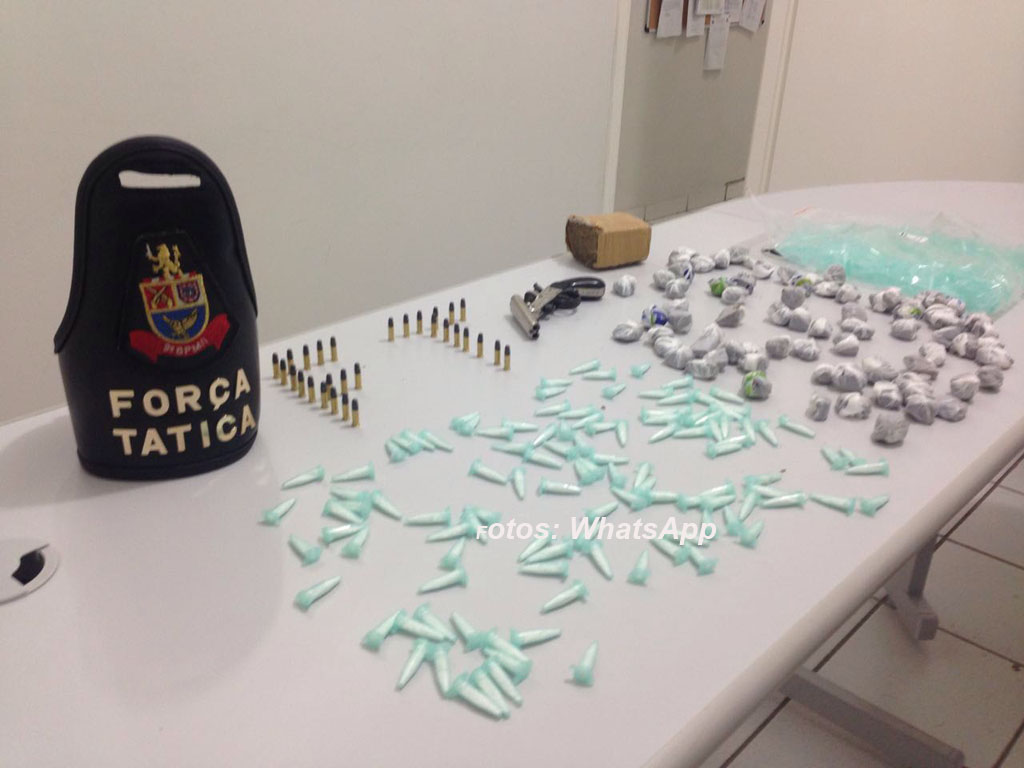 No interior do veículo, os policiais militares encontraram: um tijolo de maconha, 30 munições de calibre 22, aproximadamente 150 pinos de cocaína, 100 porções de maconha e 500 pinos vazios.