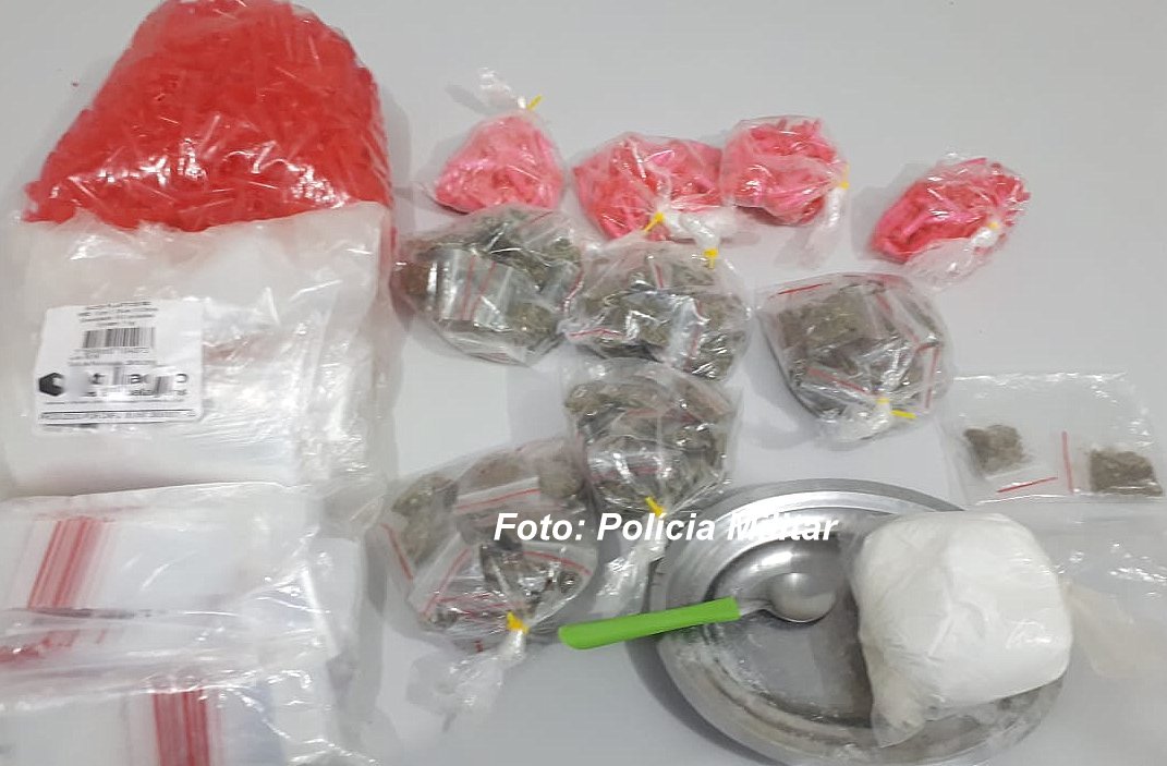 Ao vistoriar a residência, foram encontrados na cozinha uma travessa de inox contendo vestígios de pó branco e uma colher. Ao que tudo indica material usado para embalar drogas. Em um móvel da casa, foram apreendidas 202 porções de cocaína, 122 de maconha e sacos plásticos transparentes.