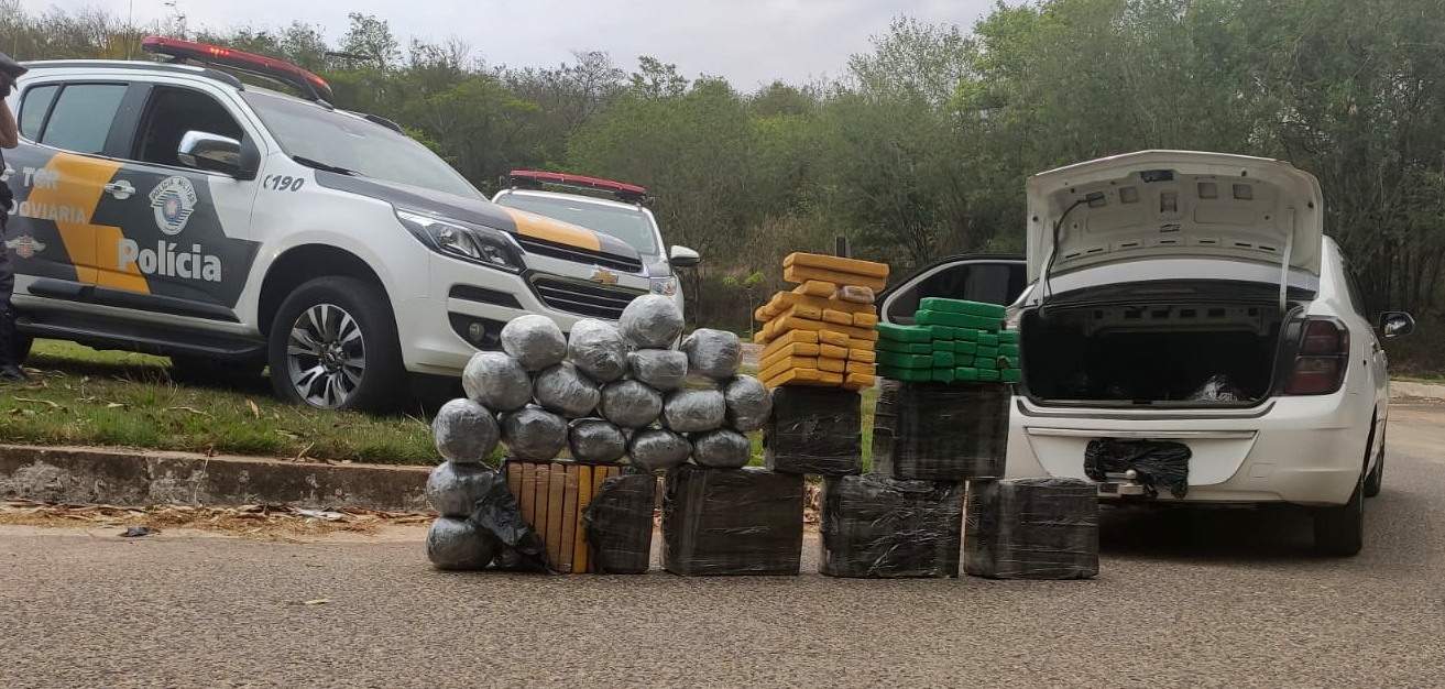 Por isso, eles resolveram fazer uma vistoria no automóvel, encontrando os entorpecentes em diversos pacotes que eram transportados no porta-malas e no banco traseiro.