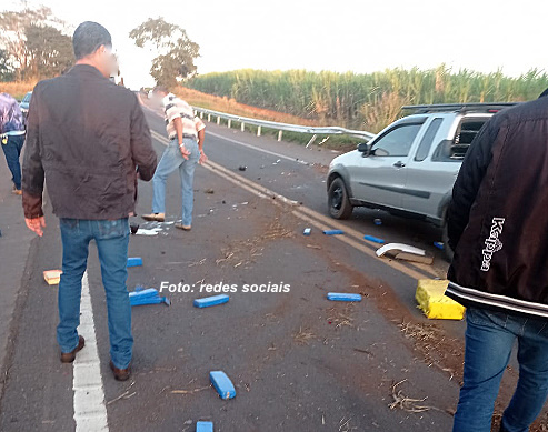 O acidente ocorreu nesta segunda-feira na rodovia Assis Chateaubriand entre Braúna e Santópolis do Aguapeí. A Polícia Rodoviária Estadual foi acionada por outros motoristas que encontraram um veículo acidentado e centenas de tijolos de maconha espalhados pela pista.