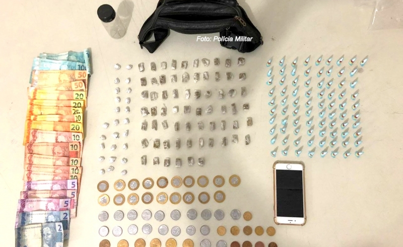 Com ele, os policiais apreenderam uma pochete contendo a quantia de R$ 498,60 ( quatrocentos e noventa e oito reais e sessenta centavos), 81 pinos de cocaína, 66 porções de maconha e 25 porções de crack.