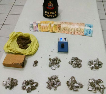 As porções de drogas e dinheiro apreendidos.