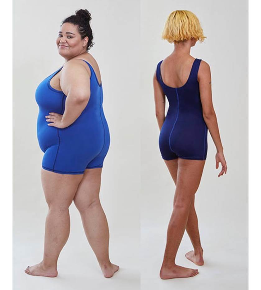 Os “maiôs” incluem pequenos bolsos nas duas laterais da cintura. Além disso, são reversíveis: podem ser usados em duas cores diferentes. A marca criou uma opção em preto e vermelho e outra com dois tons de azul – todos têm contraste nas costuras.