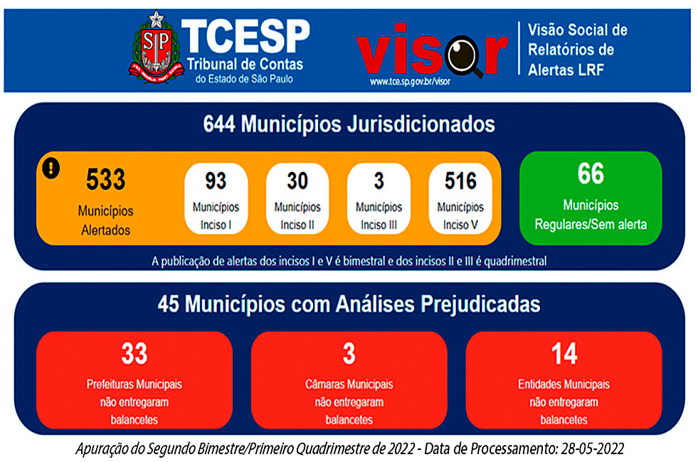 O levantamento revela, ainda, que 33 Prefeituras, três Câmaras Municipais e 14 entidades municipais deixaram de enviar o balancete contábil, conforme previsto no calendário de obrigações do TCESP.