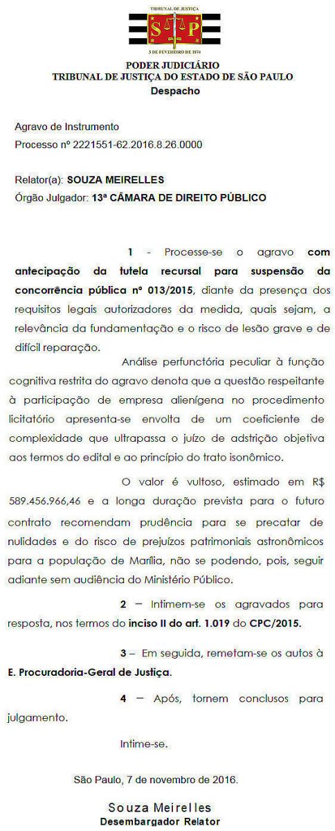 A ONG divulgou nesta manhã cópia da decisão do desembargador Souza Meirelles, da 13ª Câmara de Direito Público, que concedeu liminar ao agravo de instrumento interposto pela entidade, ao acatar o argumento de que no editam a licitação da Prefeitura estaria restringindo a participação de empresas estrangeiras, segundo informou o presidente da entidade, Edgard Cândido Ferreira. O processo de concessão do DAEM já estava na reta final.