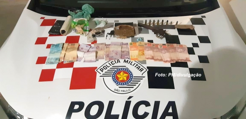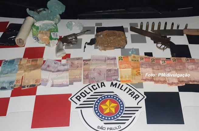 Três homens foram presos pela Polícia Militar na noite de quarta-feira (08) com armas de fogo, munições, dinheiro, um tijolo de maconha e pedra de crack em Ocauçu. A dupla que não teve a identificação revelada responderá pelos crimes de tráfico de drogas, posse e porte de arma de armas e munições.