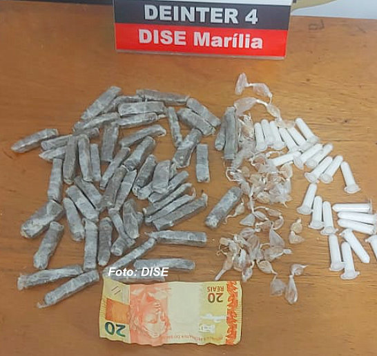Eles foram abordados, sendo localizada uma “muca” contendo 50 porções de maconha, 22 “pinos” com cocaína e 44 porções de crack, além de R$ 20,00.