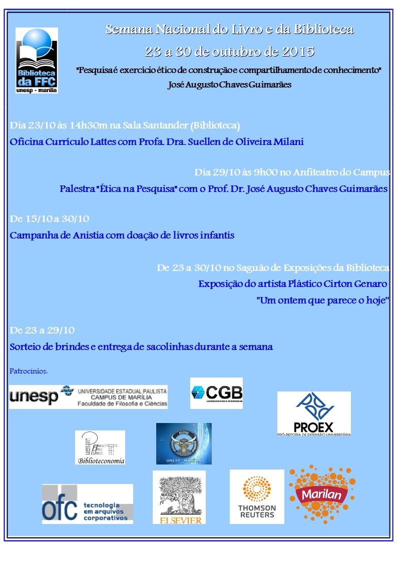 A Biblioteca da Faculdade de Filosofia e Ciências da Unesp de Marília, realiza de 23 a 30 de outubro, a XVI Semana Nacional do Livro e da Biblioteca. As atividades são gratuitas e abertas a toda população