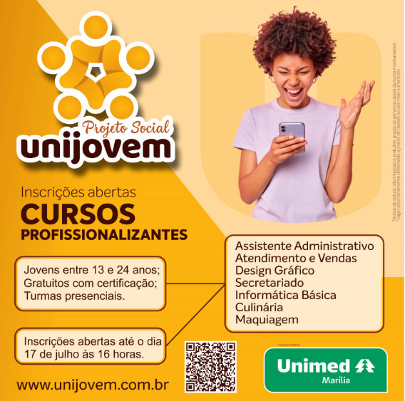 A ONG Unijovem abriu nesta semana o segundo processo seletivo deste ano para os nossos cursos profissionalizantes presenciais. Os interessados devem procurar a entidade até o dia 17 de julho (às 16:00 horas). Todas as bolsas de estudo são integrais e gratuitas, graças ao apoio da Unimed de Marília, sem custos aos participantes.